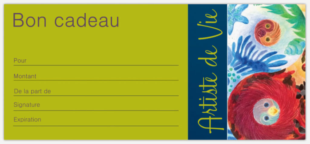 Les bons cadeaux sont disponibles au Studio Artiste de Vie ou payés en ligne et envoyés par poste.